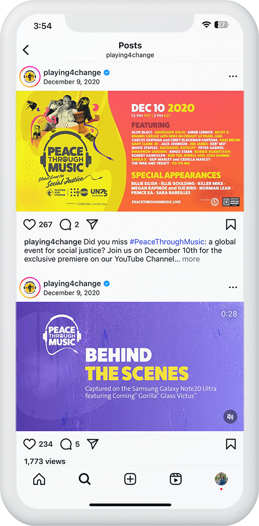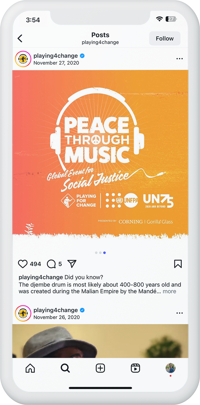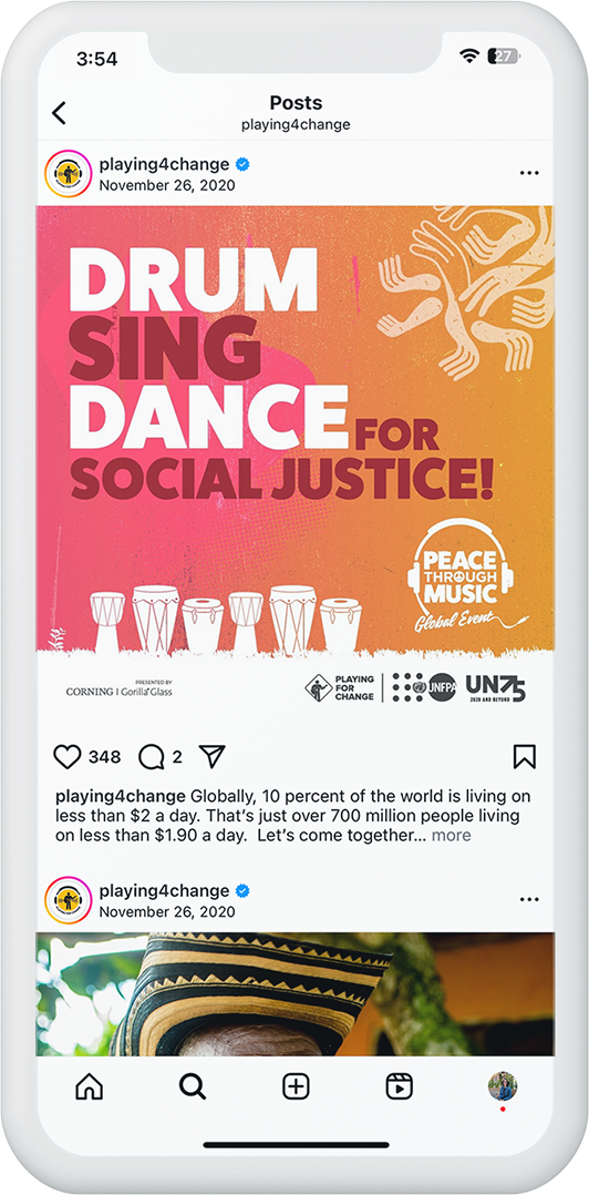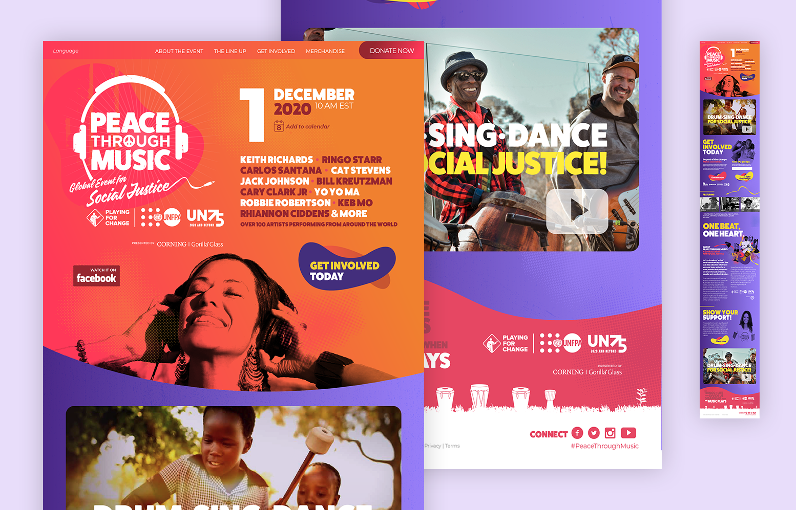 Websites, social graphics, and a digital PDF report. The featured project, Peace Through Music, a digital event created by Playing For Change can be further explored.