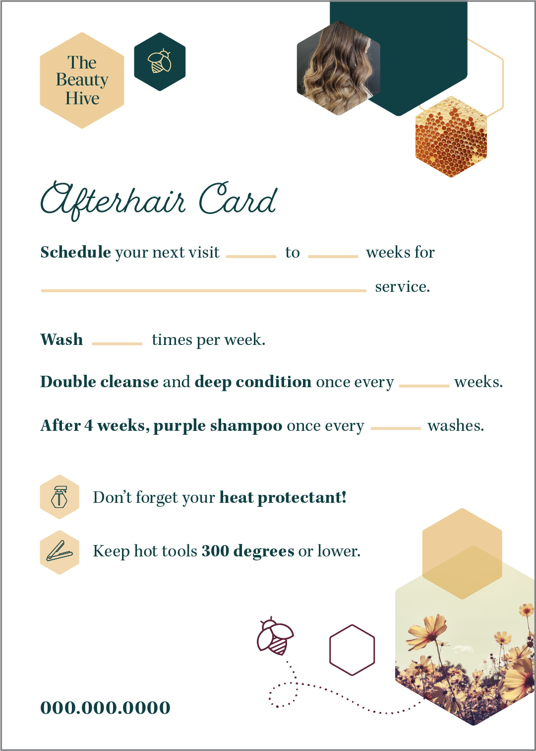 An “Afterhair Card” provided to each client to provide guidance on maintaining their new color, cut or custom styling. Easy to fill out by each stylist, the card includes contact information, and suggestions on scheduling their next visit.