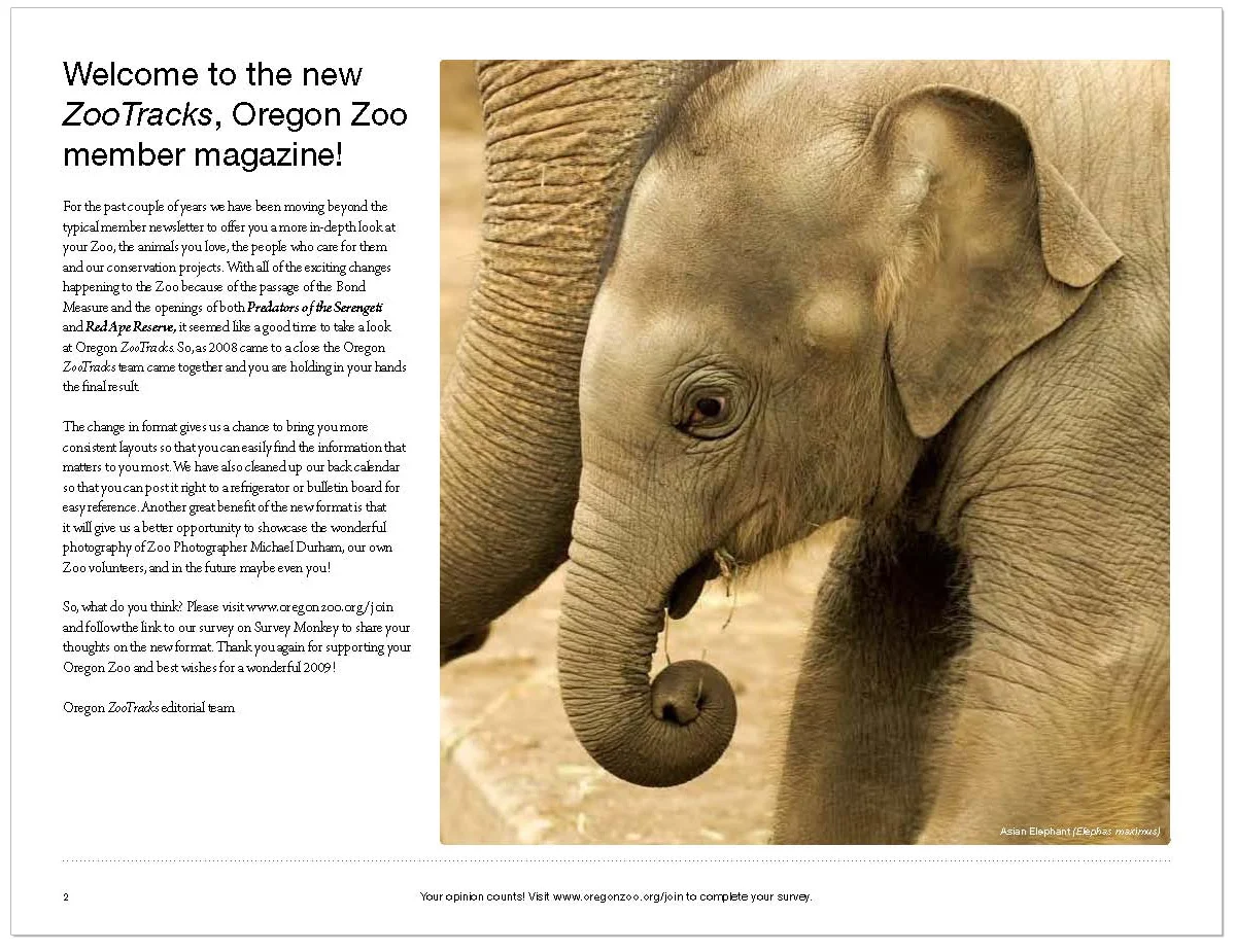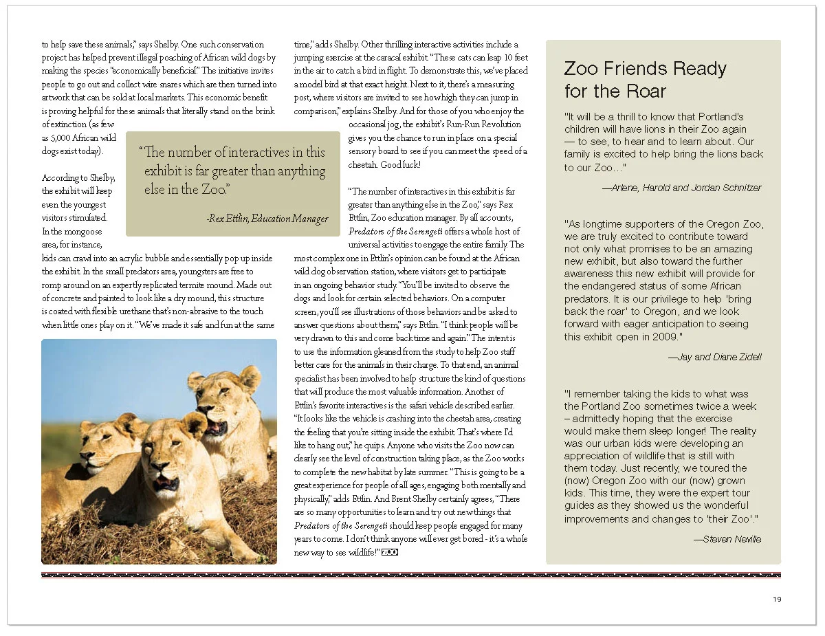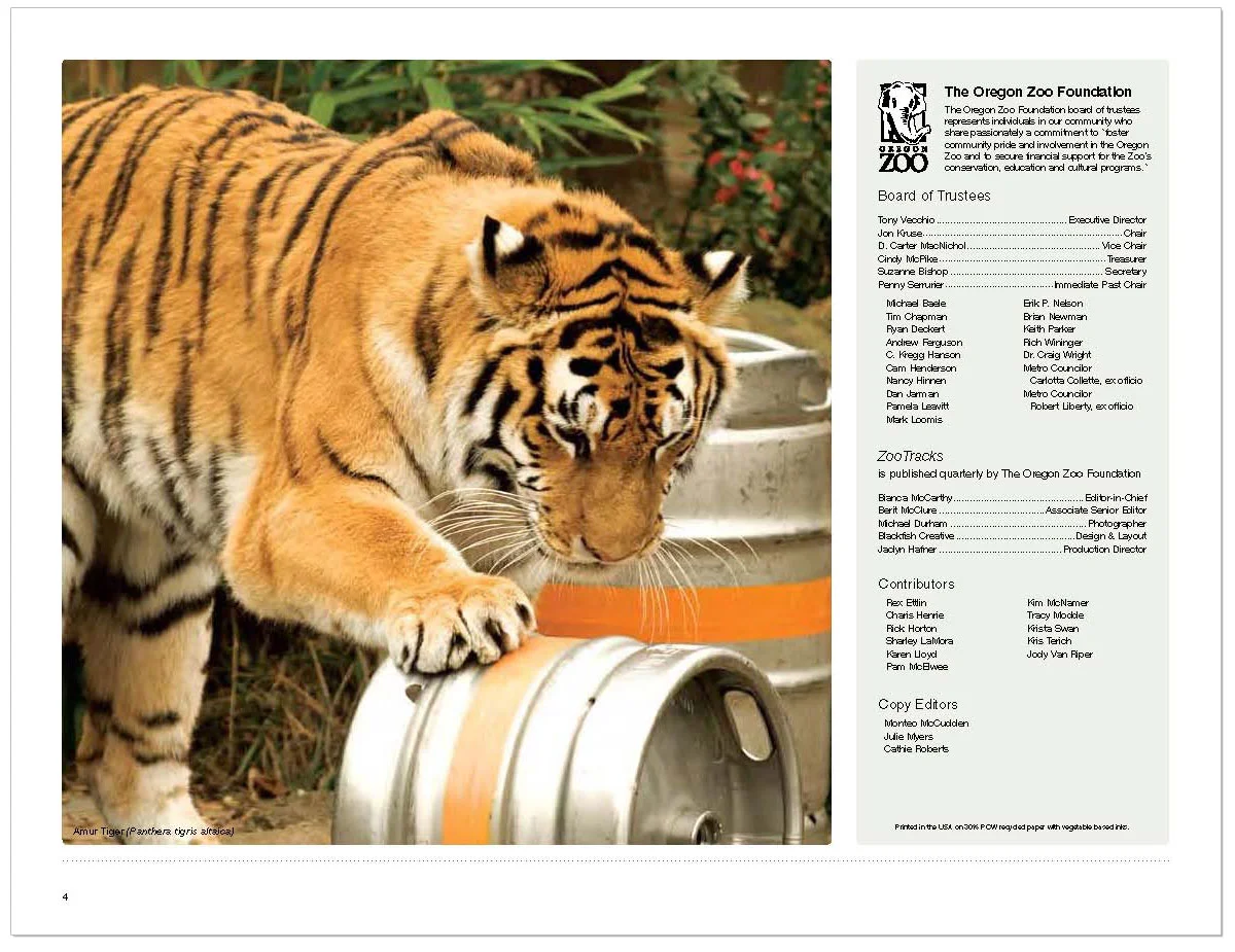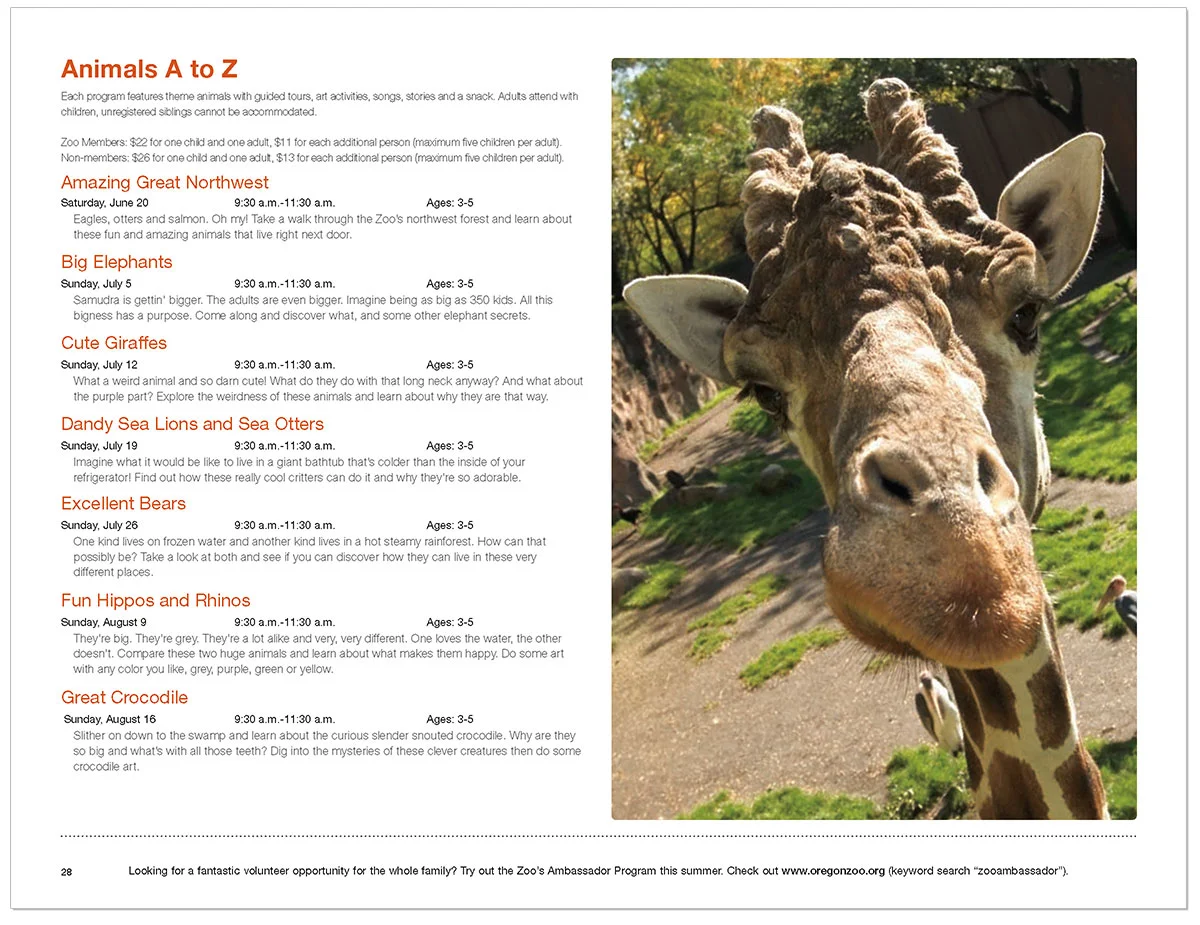 A redesign of the quarterly, Oregon Zoo member magazine, while working for Blackfish Creative, in Portland Oregon. The magazine provided news, events, animal updates and zoo activities to Oregon Zoo members in a lively and engaging format.