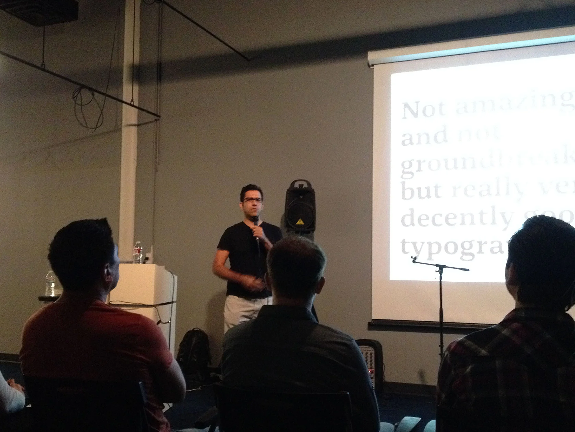 The first project that Armin showed, was a valuable lesson learned in kerning. A logo with a single word along the bottom presented two very unkerned letters. As he discussed his experience of this being brought to his attention, I will forever remember the hotdog graphic that popped up on the screen between the two letters. Everyone laughed, I laughed and I felt the room nod in understanding and recognition.